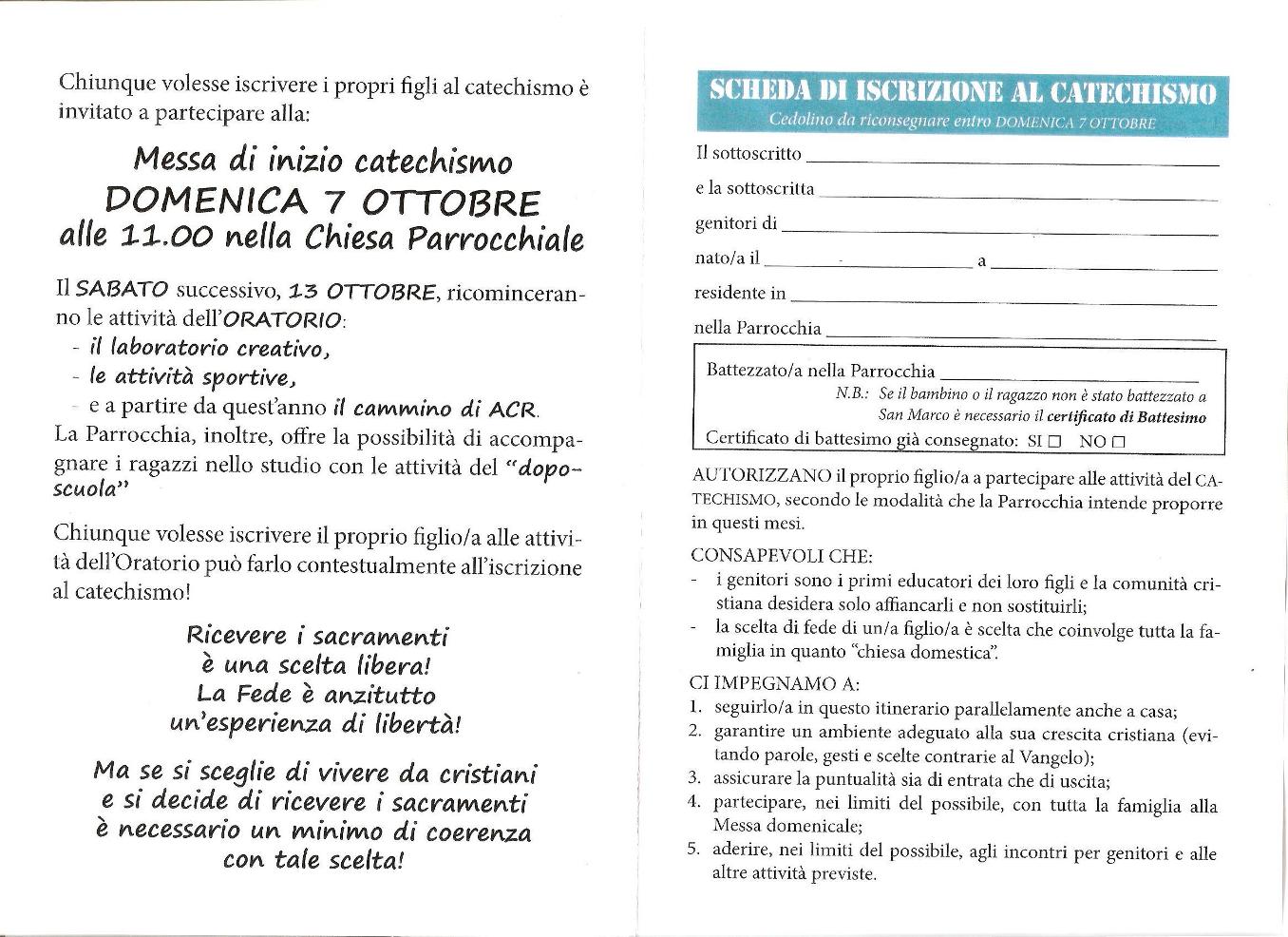 PDF Lettera ai Genitori 1. Inizio dell'Anno Catechistico L'anno catechistico inizierà Sabato 17 ottobre 2020 alle ore 16,00; 2. Modulo d'iscrizione a) Il modulo di iscrizione all'anno catechistico 2020 - 2021 può essere stampato on line sul sito della Parrocchia oppure è possibile ritirarlo presso l'Ufficio Parrocchiale, rilasciando € 10 per l'iscrizione.